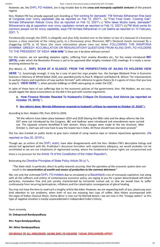 We, not only the victimized DHFL FD-Holders due to simulated (a la Baudrillard) crisis of monopoly capitalism, but along with all the sufferers and victims of contemporary economic policy, are urging to you for a green decentralized self-reliant party-less, moneyless free and just society characterized by horizontal mutual aid; or else we would have to suffer continuously from recurring bankruptcies, inflations and the catastrophic consequences of glocal heating.