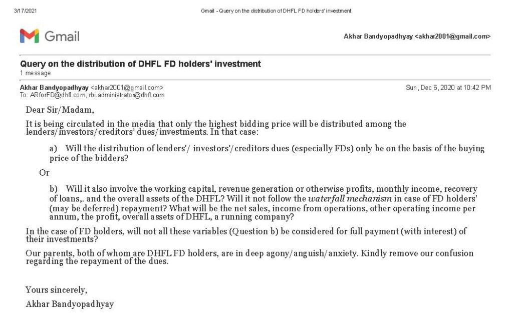 We are requesting you to kindly provide us with a copy of the approved resolution plan for showing the excellent job done by you and FD-holders’ representative by putting your blood and sweat. We must appreciate the efforts made by you and your colleagues for the benefits of all the creditors, shareholders, MF Holders, NCD and FD Holders. We are way too happy after such a great resolution.”