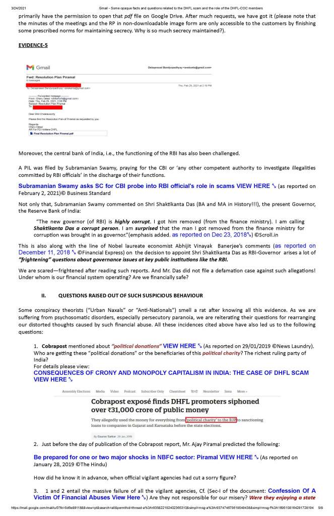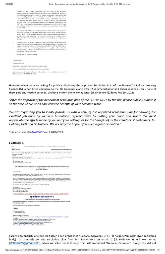 However, when we were asking for publicly displaying the approved Resolution Plan of the Piramal Capital and Housing Finance Ltd, a non-listed company, to the RBI Governor along with R Subramaniakumar and Charu Sandeep Desai, none of them paid any heed to our plea. We have written the following letter (cf. Evidence-4), dated Feb 19, 2021: