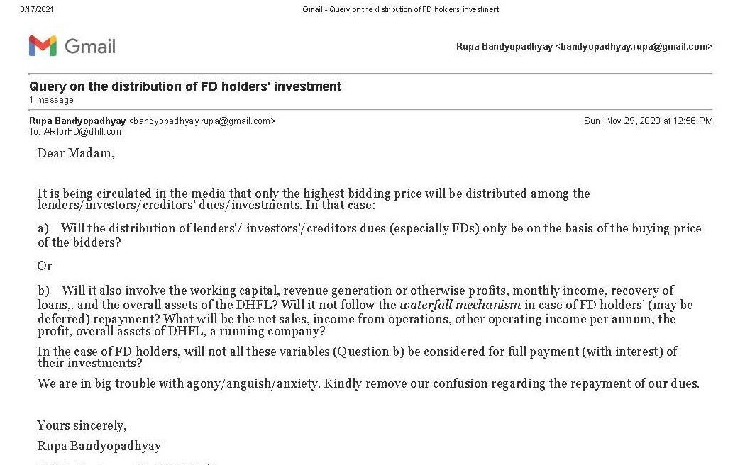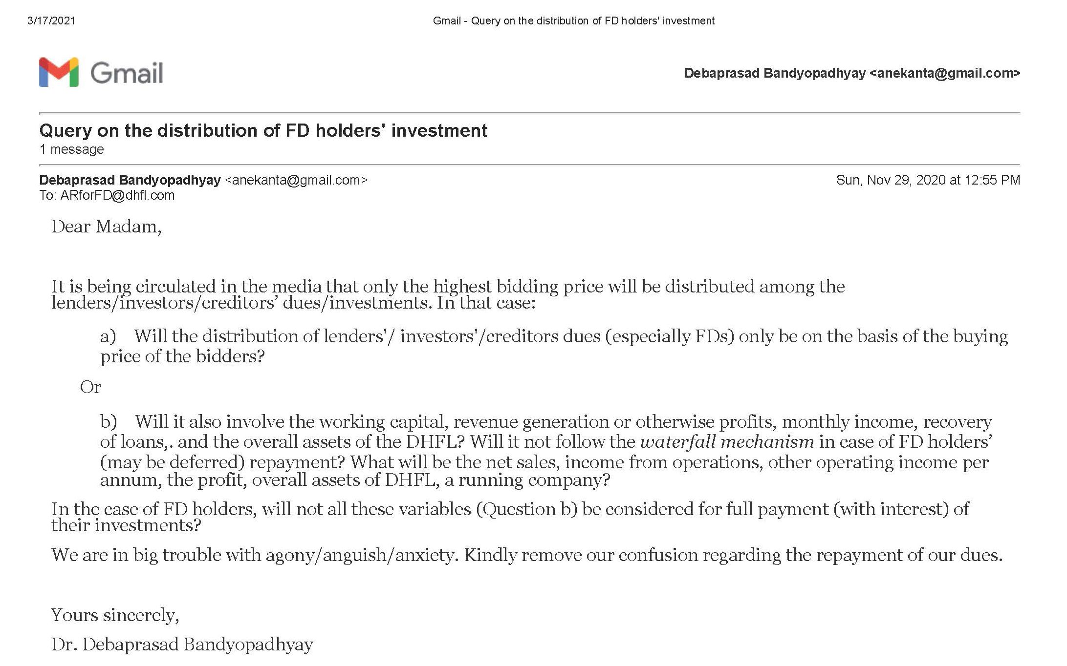 Surprisingly enough, one non-FD-holder, a self-proclaimed “National Convener, DHFL-FD-holders Pan India” (Non-registered body) had instantly got the resolution plan from Ms. Desai from an email ID (cf. Evidence 5), unknown to us (dhflarforfd@gmail.com), when we asked for it through that self-proclaimed “National Convener”, though we did not primarily have the permission to open that pdf file on Google Drive. After much requests, we have got it (please note that the minutes of the meetings and the RP in non-downloadable image form are only accessible to the customers by finishing some prescribed norms for maintaining secrecy. Why is so much secrecy maintained?).