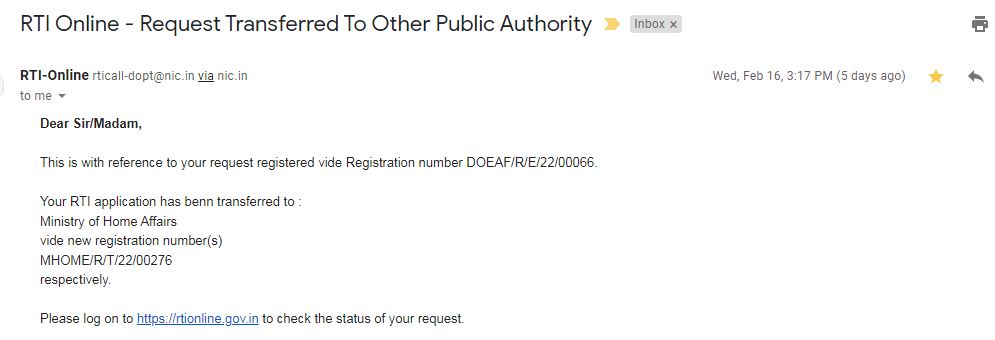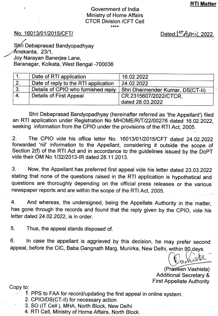 This is in response to the reply (F. No. 16013/01/2015/CFT, dated 24/02/2022) sent by Shri Dharmender Kumar, Deputy Secretary, Ministry of Home Affairs, to my RTI Application (Reg No. MHOME/R/T/22/00276, dated 16/02/2022; the application was initially addressed to the Ministry of Economic Affairs, but was later on transferred to the MHA bearing reference no. DOEAF/R/E/22/00066), wherein I was instructed to communicate with you for further clarification regarding my matters of concern.