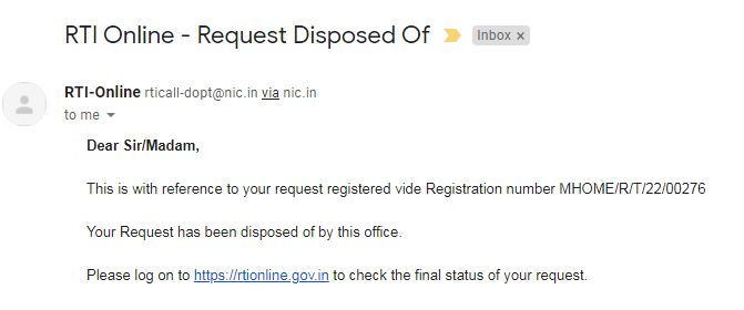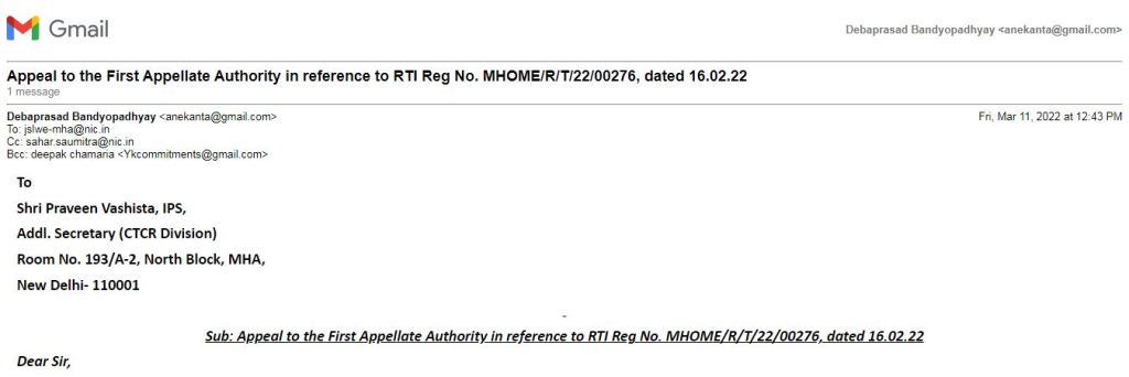 Sub: Appeal to the First Appellate Authority in reference to RTI Reg No. MHOME/R/T/22/00276, dated 16.02.22