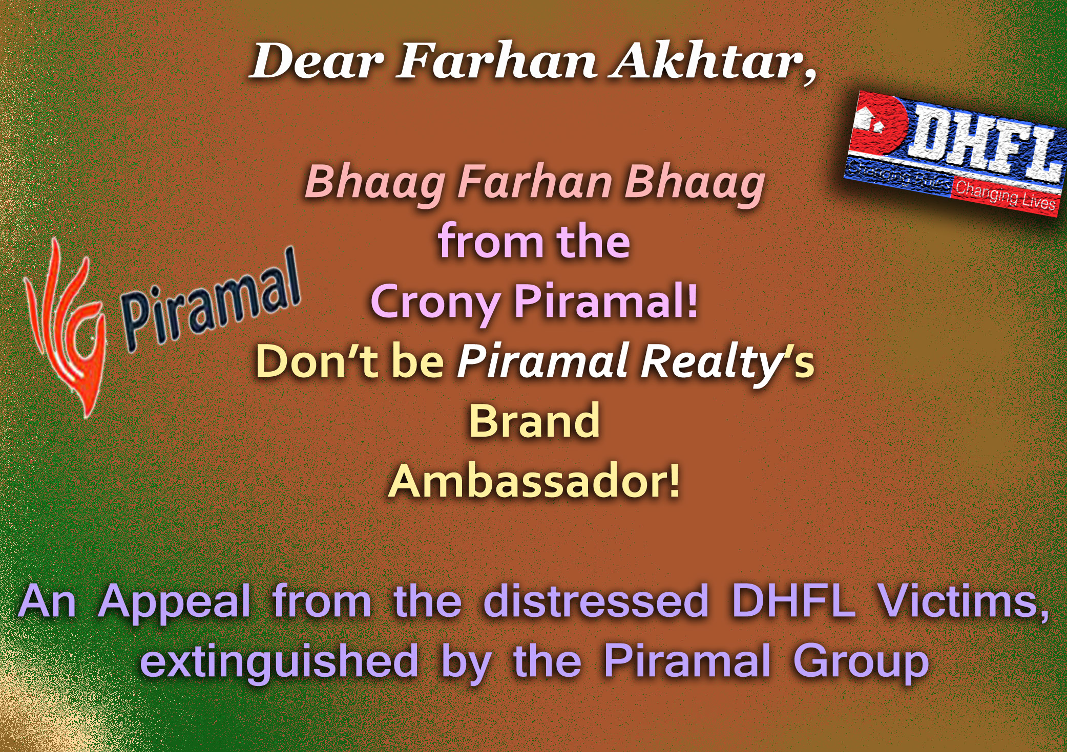 Posted on 26th February, 2022 Dear Farhan Akhtar, This has come to our knowledge that you are a brand ambassador of Piramal Realty, a part of the Piramal Group. This is to kindly inform you regarding some of Mr. Ajay Piramal’s deeds through the following two links: 1. WHO IS AJAY PIRAMAL? VIEW HERE ⤡ 2. … Continue reading Bhaag Farhan Bhaag from the Piramal Group: a humble appeal to Mr. Farhan Akhtar