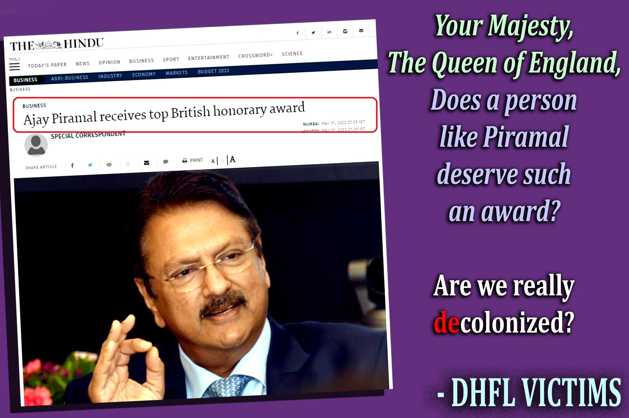 Posted on 26th May, 2022 Updated on 28th June, 2022 To Her Majesty the Queen Elizabeth II, The Buckingham Palace, London SW1A 1AA, United Kingdom Sub: An Open Letter to the Honourable Queen of the United Kingdom regarding the Honorary CBE awarded to Mr. Ajay Piramal Your Majesty, We, the undersigned, are informed that Mr. … Continue reading An Open Letter to the Honourable Queen of the United Kingdom regarding the Honorary CBE awarded to Mr. Ajay Piramal