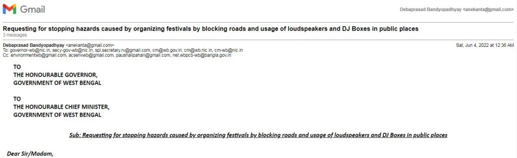 We are earnestly requesting you to stop such a particular hazard from taking place as well as all other incidents of frequent road-blocking due to the occurrence of such high-decibel festivals or jalsa (party or celebration). We are also sincerely praying for stopping the use of DJ Boxes and Loudspeakers in public places, irrespective of the particular religion or political party.