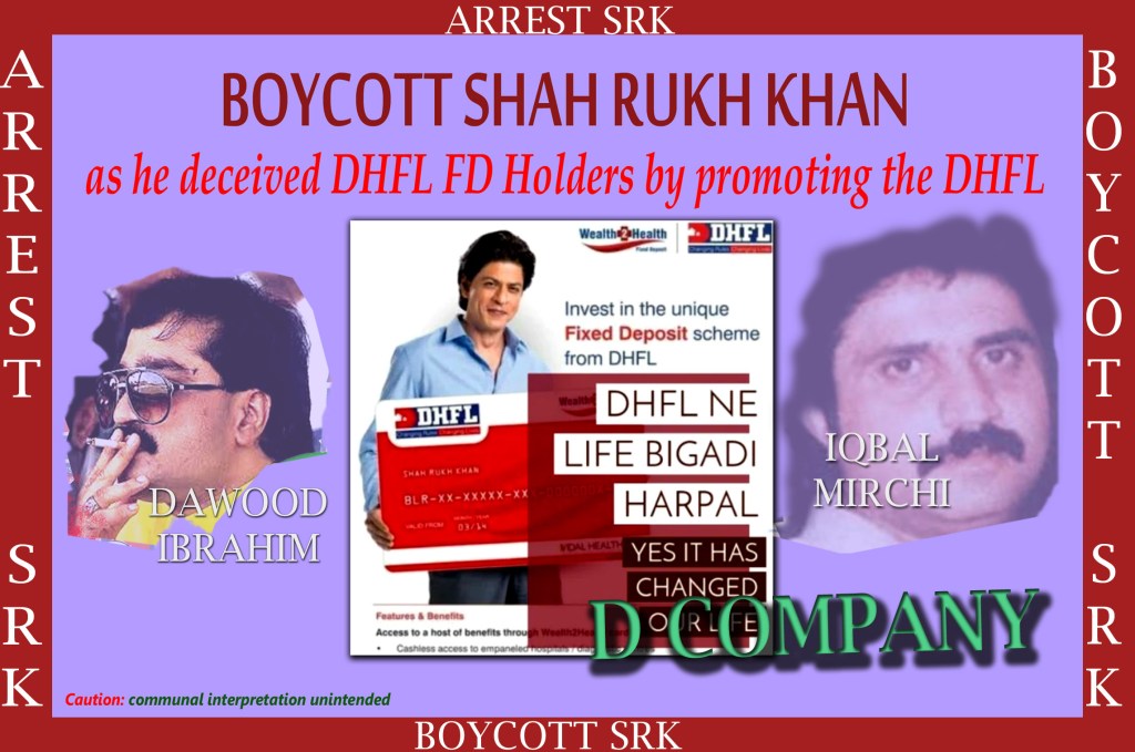 Dear All, we have got the following letter from an anonymous person, demanding the arrest and boycott of Mr. Shah Rukh Khan and his films for his passive role in the DHFL Scam. The anonymous person has mentioned our previous letter to the Don, the former Brand Ambassador of the DHFL. We request the DHFL Victims to go through the letter (we have also separately attached the two posters that came with the mail). Any unsolicited, unwarranted communal implication will not be entertained.