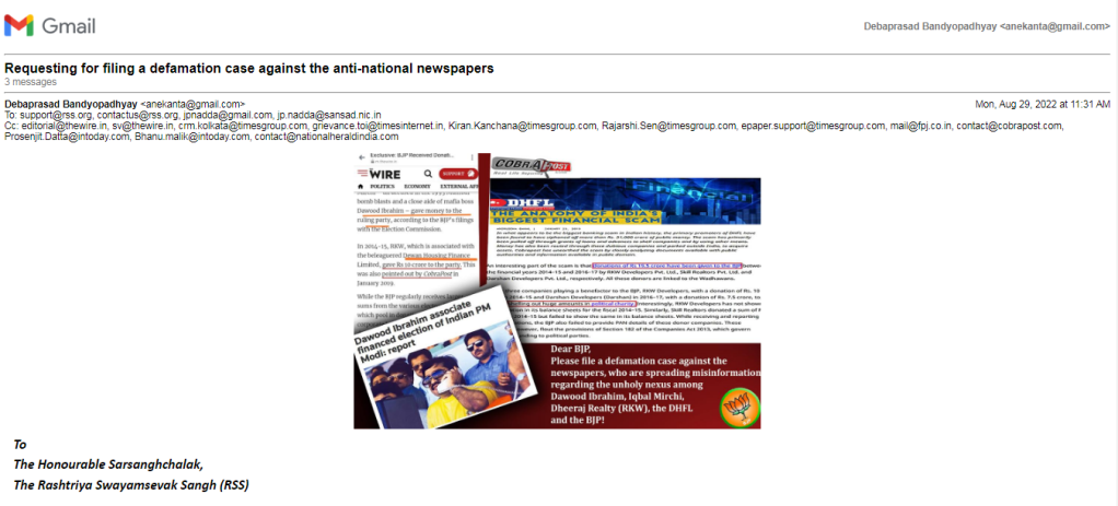 In connection with our RTI on the question of terror-funding of the BJP, we are earnestly requesting you to file a defamation case against the following newspapers, who had published such misinformation regarding the unholy nexus among Dawood Ibrahim, Iqbal Mirchi, Dheeraj Realty (RKW Developers Private Limited), the DHFL and the BJP: