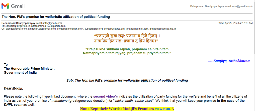 ⤡indicates the utilization of party funding for the welfare and benefit of all the citizens of India as part of your promise of mahadana (great/generous donation) for “sabka saath, sabka vikas“. We think that you will keep your promise in the case of the DHFL scam as well: