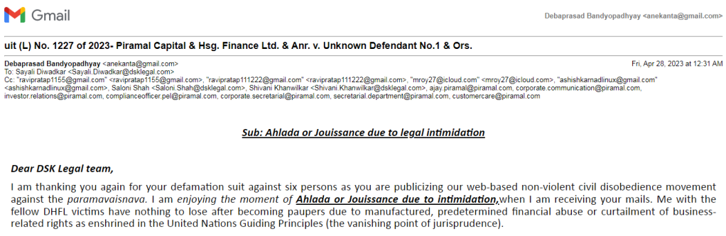 I am thanking you again for your defamation suit against six persons as you are publicizing our web-based non-violent civil disobedience movement against the paramavaisnava. I am enjoying the moment of Ahlada or Jouissance due to intimidation,when I am receiving your mails. Me with the fellow DHFL victims have nothing to lose after becoming paupers due to manufactured, predetermined financial abuse or curtailment of business-related rights as enshrined in the United Nations Guiding Principles (the vanishing point of jurisprudence).