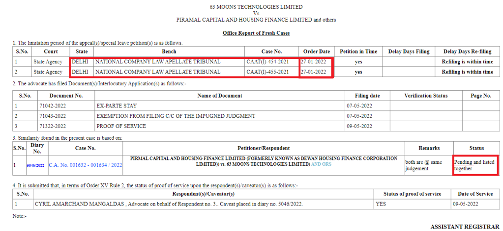 c. The NCLAT verdict (27.01.2022) that designated the CoC resolution process to be “contrary to law”, “void” and as containing “material irregularities” was stayed by (in terms of a temporary restraining order or ex parte stay, not a blanket stay order but one that is still pending in the apex court of law) the Hon. Supreme Court on 11.04.2022 after Mr. Piramal approached it on 01.03.2022 without first approaching the High Court. [Cf. Case No. 5046/2022 (25-02-2022 12:31 PM) C.A. No. 001632 – 001634 / 2022 Registered on 25-02-2022]