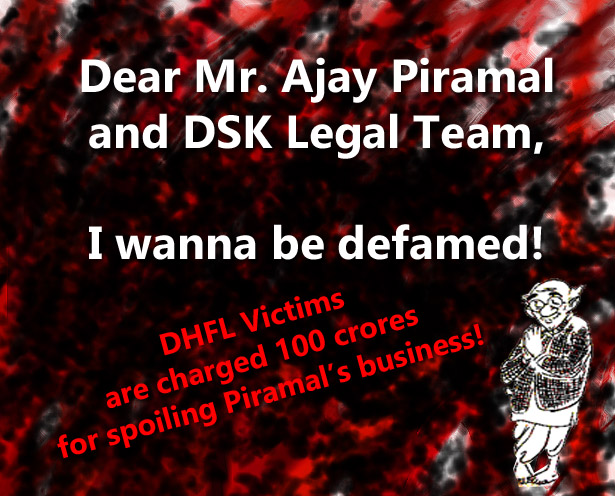 However, the DSK Legal Team’s research and investigation are very poor. We have spread the philanthropic deeds of Mr. Piramal throughout the web, which are not mentioned by the DSK Legal team. We have used multiple platforms simultaneously such as Flickr⤡, Tumblr ⤡, Pinterest ⤡, Instagram⤡ , WordPress ⤡, Mouthshut ⤡, Hello Peter⤡ etc, apart from Facebook⤡, Linkedin⤡ and Twitter⤡. Therefore, the compensation amount should be more than 100 crores (though it is fictitious and arbitrary) as per the logic of the situation. This is also to be mentioned that I, the undersigned, will myself bear the whole cost for “damaging” your business. Please leave the other five accused defendants. I will bear the cross till the end for the sake of preserving your obsessive habit ⤡ to take recourse to the legal path again and again by filing defamation cases whoever is found accusing you of something. Your several stay orders entail the sthitalakṣaṇa (thetic or static characteristic) of an actual paramavaiṣṇava. We appreciate your occupation, or otherwise, adverse possession of the DHFL (with the help of the ruling party) through reverse merger when it is still under adjudication.