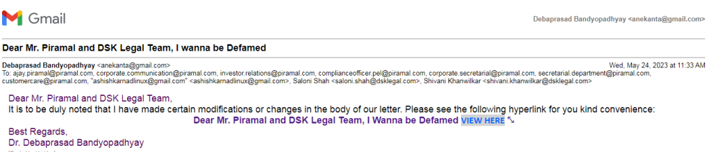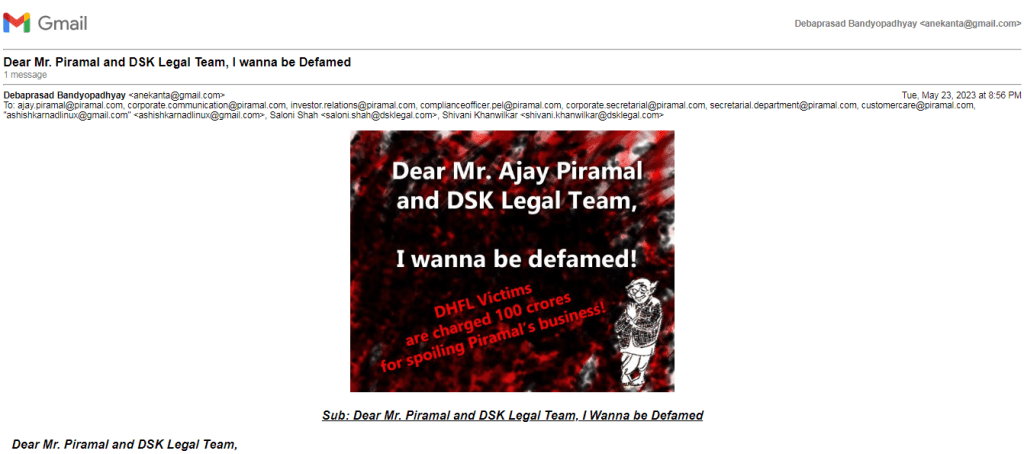 The article is an open letter addressed to Ajay Piramal, chairman of Piramal Capital and Housing Finance Limited (PCHFL), and his legal representatives at DSK Legal. Written with a tone of irony and defiance, it continues the authors’ ongoing dispute with PCHFL over legal notices issued in response to their online criticism of the company’s acquisition of Dewan Housing Finance Corporation Limited (DHFL). The authors challenge the defamation claims made against them, asserting that their public statements are part of a broader “web-based non-violent civil disobedience movement” aimed at exposing alleged crony capitalism and corporate misconduct. They sarcastically express a desire to be “defamed” further, implying that PCHFL’s legal actions only amplify their platform and resolve. The letter questions the validity of claims that their content caused significant reputational or financial damage to PCHFL, framing the company’s legal strategy as an attempt to suppress legitimate dissent rather than address the underlying issues raised. The authors appear to welcome the prospect of a legal confrontation, viewing it as an opportunity to further their cause.