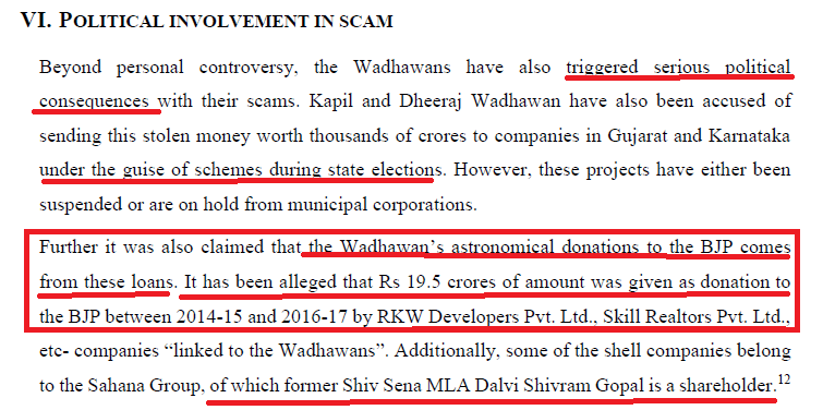 - “Further it was also claimed that the Wadhawan’s astronomical donations to the BJP comes from these loans. It has been alleged that Rs 19.5 crores of amount was given as donation to the BJP between 2014-15 and 2016-17 by RKW Developers Pvt. Ltd., Skill Realtors Pvt. Ltd., etc- companies “linked to the Wadhawans”. Additionally, some of the shell companies belong to the Sahana Group, of which former Shiv Sena MLA Dalvi Shivram Gopal is a shareholder.” (ibid.)