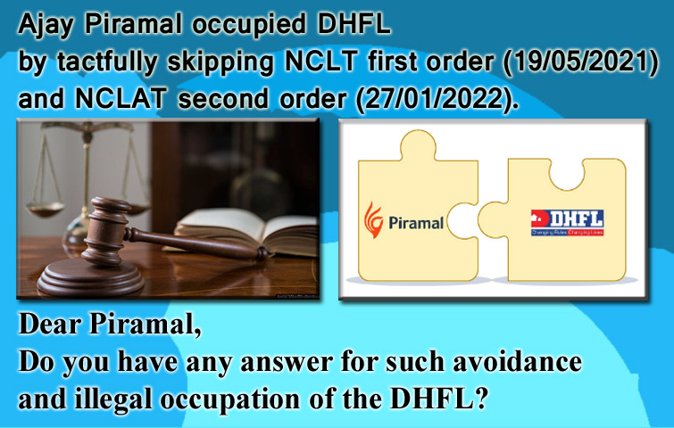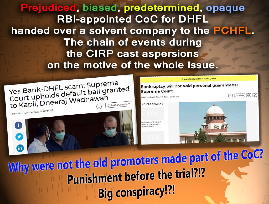 e) It does not highlight the absence of the ex-promoters of DHFL, viz., the Wadhawans, in the decision-making process of the RBI-appointed CoC, as well as why the CoC constantly rejected the Wadhawans’ pleas for full repayment, as evidently pointed out by the NCLT in its first order dated 19/05/2021, that was superseded by the RBI-CoC in terms of a contempt of court by hurrying off to the NCLAT.