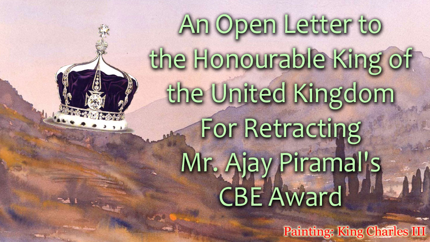 Posted on 06/09/2023 (GMT 11:30 hrs) To His Majesty the King Honourable Charles Philip Arthur George, The Buckingham Palace, London SW1A 1AA, United Kingdom Sub: Requesting for Retracting Mr. Ajay Piramal’s Honorary CBE Award with Immediate Effect Your Majesty, First of all, we must bestow our grief in the memory of the late Queen. Mourning … Continue reading An Open Letter to the Honourable King of the United Kingdom For Retracting Mr. Ajay Piramal’s CBE Award