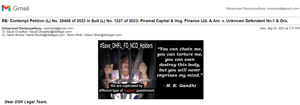 We are proud and happy to note that Piramal’s legal team, viz., DSK Legal, has brought the charge of Contempt of Court against Dr. Debaprasad Bandyopadhyay⤡ (Unknown Defendant No. 6; it is surprising that they do not yet know Dr. Bandyopadhyay’s address, age etc., though he is an FD holder of DHFL and Mr. Piramal put 23.07% of deposit amount from Dr. Bandyopadhyay’s investment in the latter’s bank; hence, the details must have been already available with them!), for fighting for the business-related human rights of financially abused victims in the context of the DHFL scam.