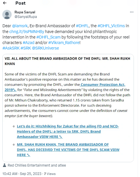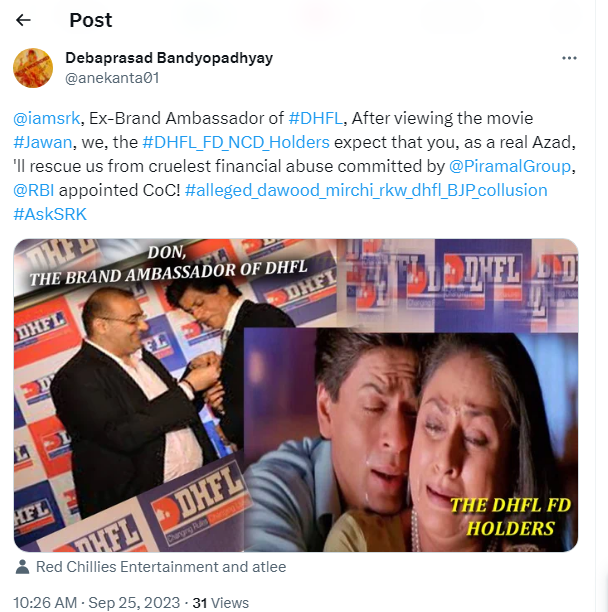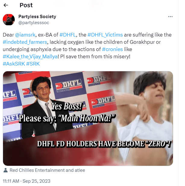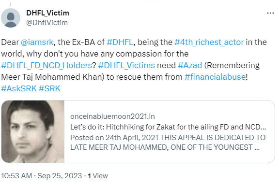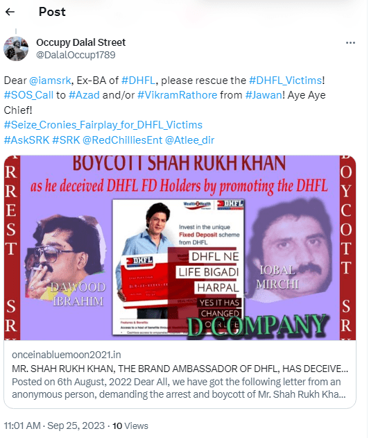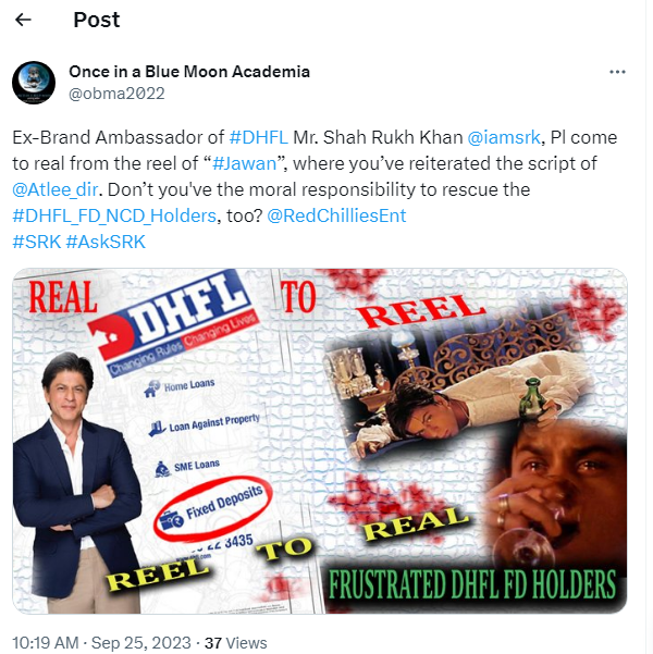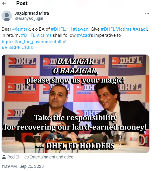 Given below are the recent tweets by some DHFL victims to Mr. Shah Rukh Khan, in relation to his recent blockbuster: Jawan. The tweets strive to communicate to Mr. Khan the sufferings and miseries of the DHFL Victims!