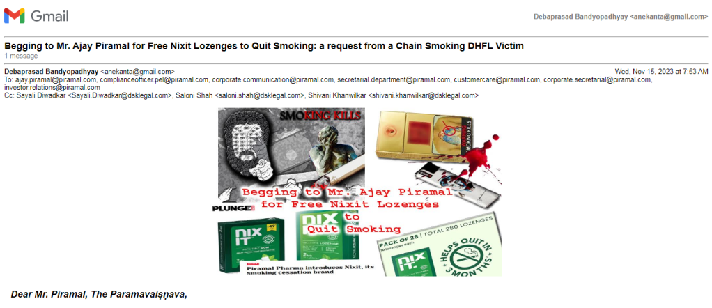 The fun part is, my addiction to nicotine (along with other narcotics; thanks to Mr. Adani’s Mundra Port!) is an outcome of the DHFL scam⤡ ⤡, which has the person “you” at the very vortex of the politico-economic narrative. Hence, the cause of my suffering appears to be your company, and I am seeking the “resolution” of the same to your pharma-company itself! How pathetic the state of the DHFL victims is, you cannot even imagine. For your kind information, I have already appealed to the apex authorities (especially the President of the Indian Republic) of the Indian nation-state for legalizing active euthanasia⤡ — it is very difficult to live in the wounded India⤡, therefore, I wish to die with dignity and without pain.