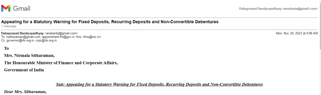 We are forwarding you this letter dated 20.11.2023⤡, initially addressed to the Honourable Minister of Finance and Corporate Affairs (and copied to the Honourable Governor, the Reserve Bank of India), having the subject “Appealing for a Statutory Warning for Fixed Deposits, Recurring Deposits and Non-Convertible Debentures”. As there is no statutory warning to be found in the advertisements for Fixed Deposit investment, we are requesting you, after the Dewan Housing Finance Corporation Limited (DHFL) Scam⤡ ⤡, to put a statutory warning (in the likeness of share market, SIP and Mutual Fund advertisements) in the case of fixed deposits being an “unsecured” investment.
