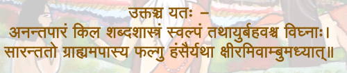 “Since verbal science has no final end. Since life is short, and obstacles impede. Let central facts be picked and firmly fixed. As swans extract the milk with water mixed.” (Pañcatantra)