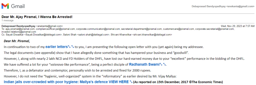 Mr. Piramal, The Paramavaiṣṇava has filed consecutive defamation (Rs. 100 Cr) and contempt petitions (Rs. 2000 fine and 6 months’ imprisonment) against Dr. Debaprasad Bandyopadhyay (along with 9 others), signified as an “unknown defendant no. 6” (Remembering the metonymic condensation of Goldmine workers in Tagore’s The Red Oleanders)!