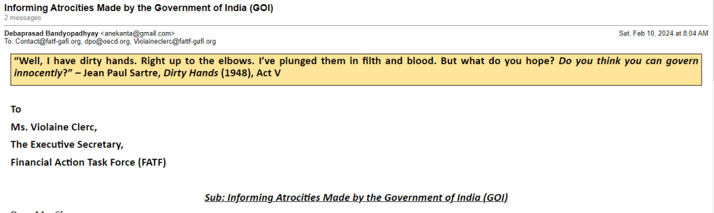As one of the goals of the Hon’ble FATF is to share information, we are just sharing all these collected/reported information as contingent citizens of the Indian republic. We have worked as bricoleurs to maintain the duty of being responsible citizens. The next progeny will suffer due to the burden of the huge debt taken from the three international terrorist organizations: WB, IMF and WTO.