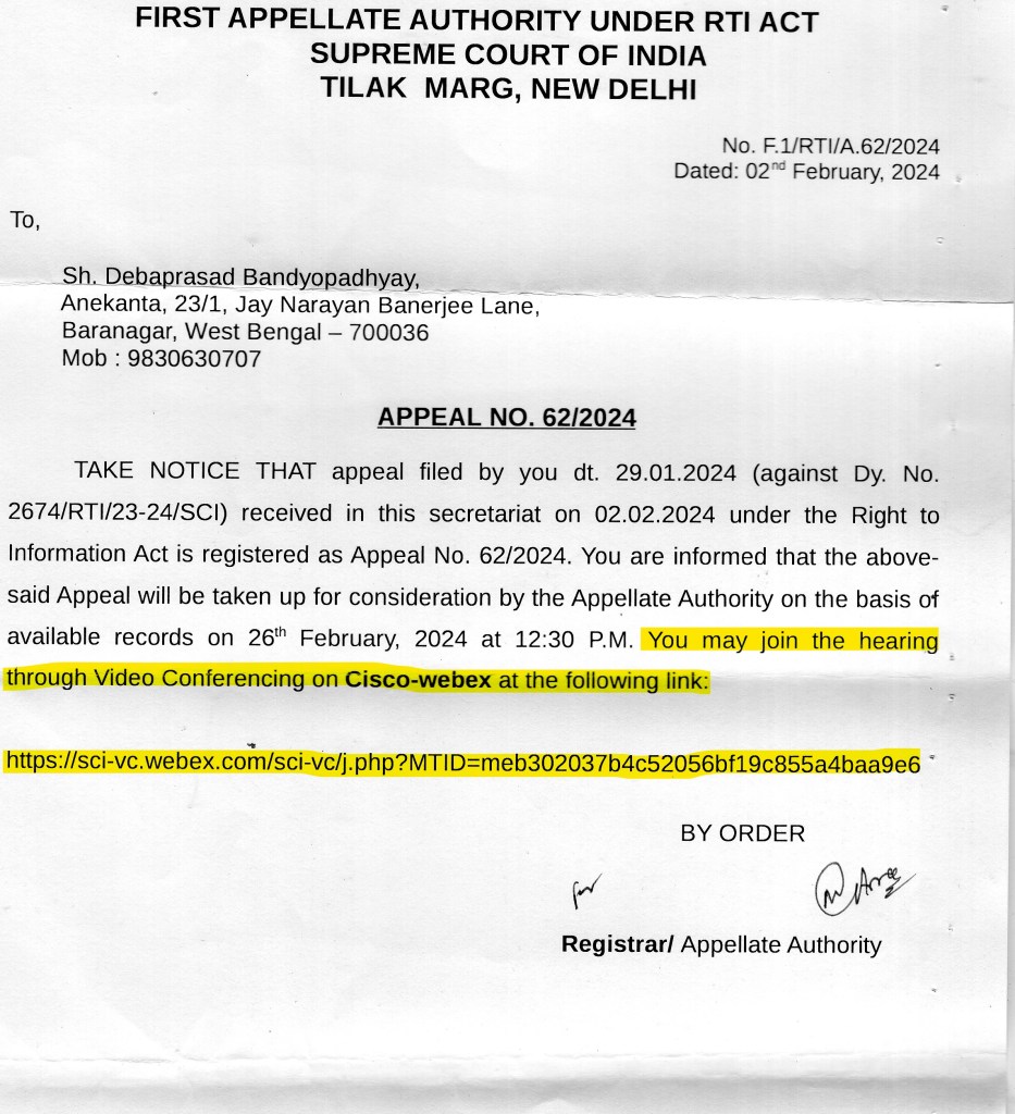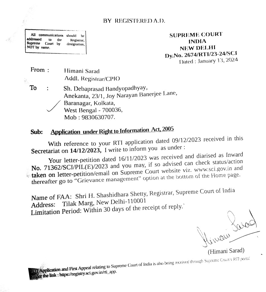 The New Diarized Application No. in the Supreme Court for our RTI became: Dy. No. 2674/RTI/23-24/SCI.
