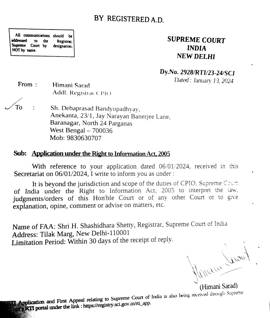 In connection with my RTI Dy. No. 2928/RTI/23-24/SCI, this is to inform you that the answer sent by your CPIO on 13th January, 2024, is beyond my comprehension, and at the same time (as per as my understanding, legal competence and cognitive ability) not properly addressing the particular questions raised in my RTI application. As per Section 2(f) of the Right to Information Act (2005), giving opinions/advices on matters of public concern fall under the purview of the definitional fixation of “information” per se.