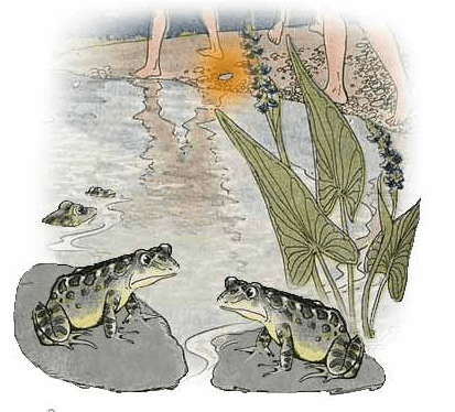 The stones were flying thick and fast and the Boys were enjoying themselves very much; but the poor Frogs in the pond were trembling with fear.