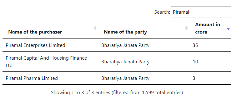 Piramal Capital & Housing Finance had purchased electoral bonds worth Rs 10 crore, while PHL Finvest and Piramal Enterprises had donated Rs 40 crore and 35 crore, respectively, through bonds.”