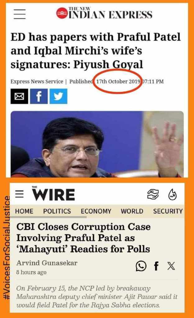 It is no wonder that despite such allegations made by Mr. Goyal and the CBI-ED actions on the “Patel Aviation and PMC Bank Scam”, Mr. Patel has recently on 28.03.2024 got a “clean chit” (a closure of the corruption case against him has taken place) from the CBI (the CBI made a case against Mr. Patel in 2017 about a 2006 scam), eight months after joining the BJP-bloc.