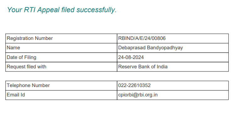 We made two consecutive first appeals to the first appellate authorities on 24th August, 2024, under the IBBI as well as the RBI, with the same following text: