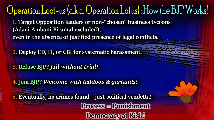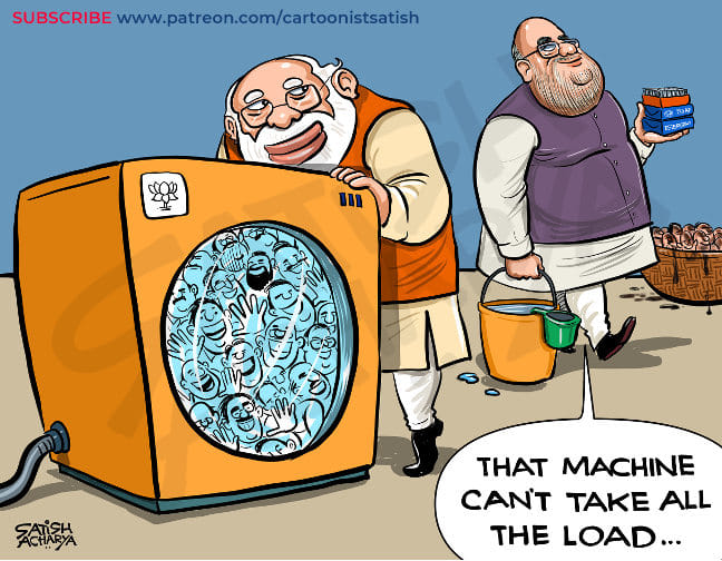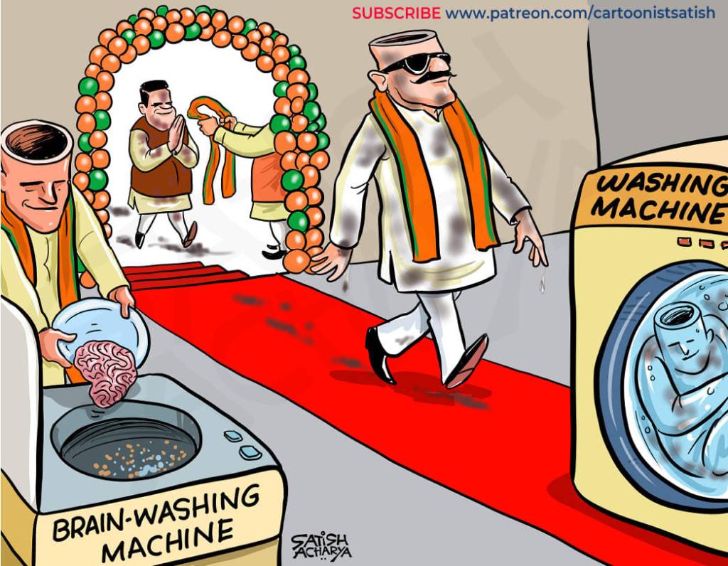 The BJP’s modus operandi in such cases often involves targeting opposition leaders they perceive as “threatening.” They inundate these individuals with arbitrary legal challenges and intimidate them through ED, CBI, and IT raids, especially through the manipulative deployment of the controversial PMLA. However, if these leaders choose to join the BJP, they frequently find themselves conveniently absolved of their “past sins.” Notable examples include Chandrababu Naidu, Ajit Pawar, Suvendu Adhikari, and Mukul Roy, among others. This phenomenon is aptly dubbed as the “Great Indian Washing Machine”—and the BJP is at its helm!