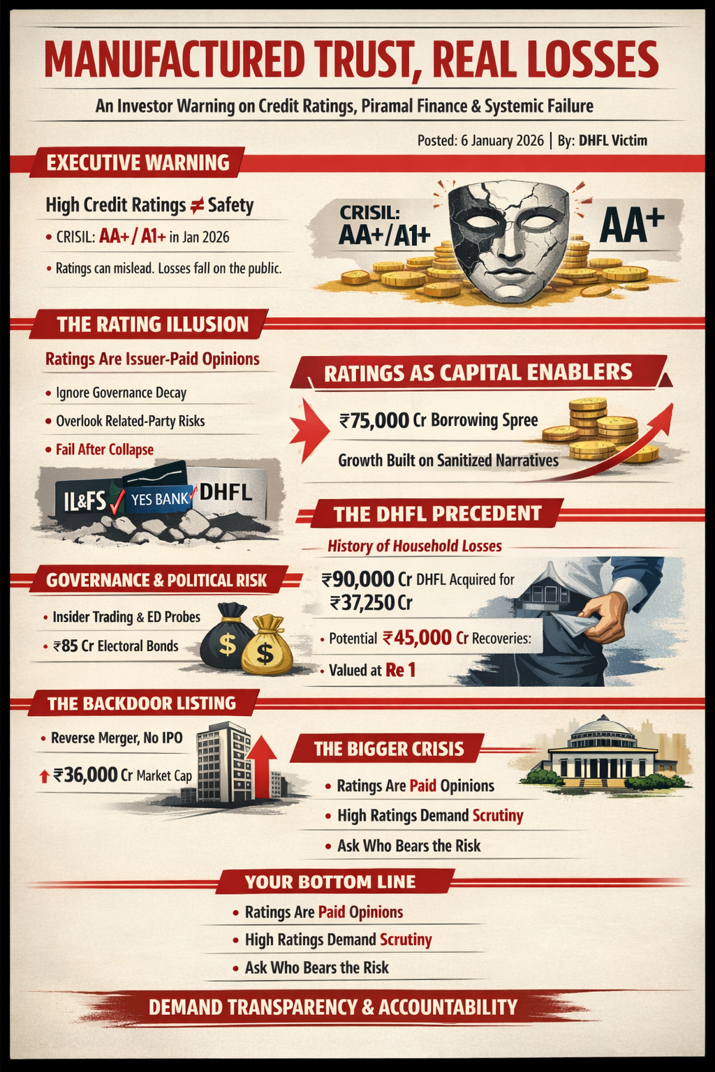 Despite glowing CRISIL AA+/Stable ratings, Piramal Finance’s strength is an illusion built on conflicted issuer-paid ratings, legacy DHFL fraud asymmetries (₹45,000 Cr recoveries valued at Re 1, massive retail haircuts), governance controversies, political proximity, and a backdoor listing that bypassed scrutiny. High ratings enable cheap funding and retail mobilisation—while systematically ignoring forensic risks, related-party issues, and resolution inequities seen in IL&FS, Yes Bank, DHFL. This is systemic: manufactured trust, socialised losses, privatised gains. Ratings are opinions, not guarantees. Demand truth before investing.