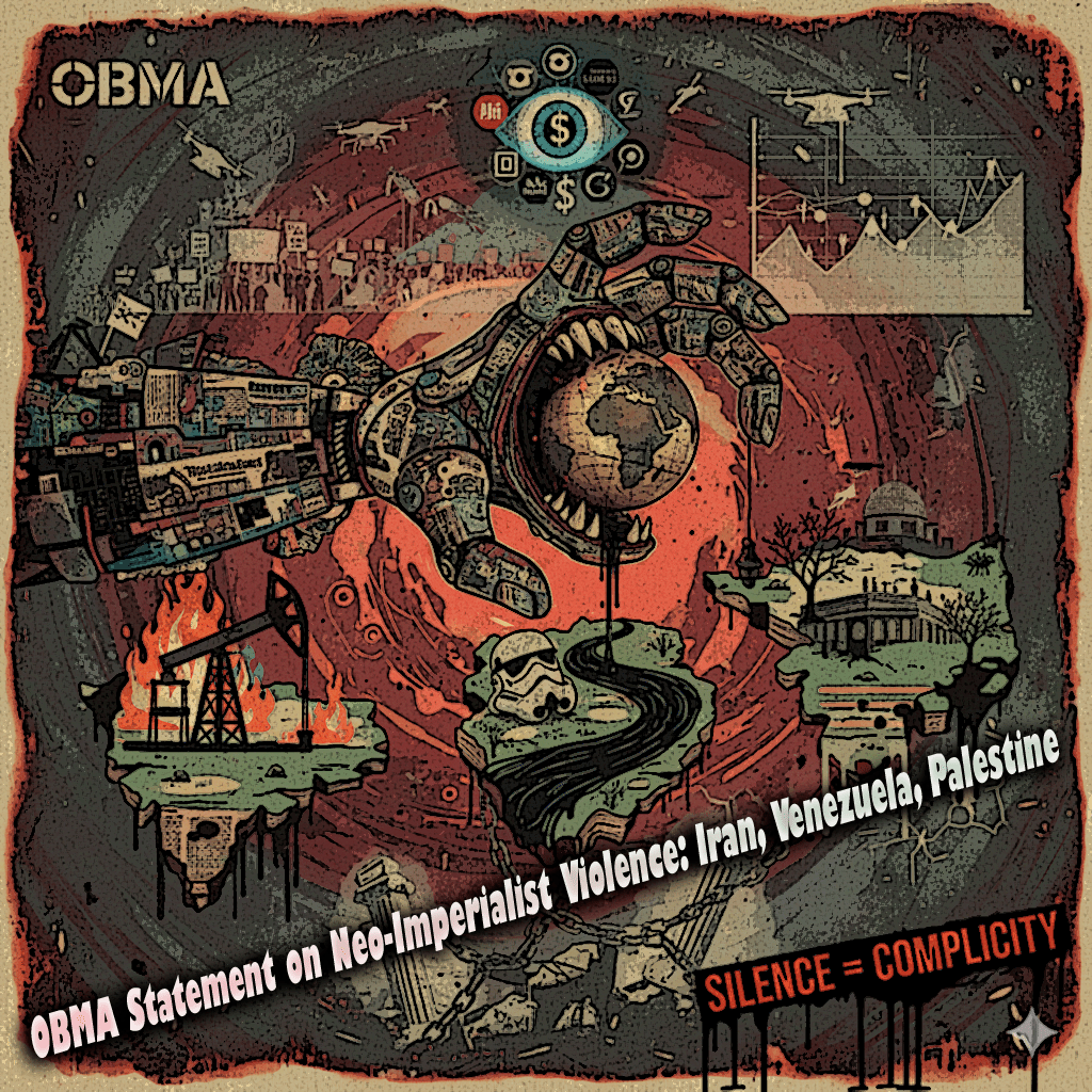 OBMA unequivocally condemns these crimes. We reject U.S. neo-imperialism, theocratic authoritarianism, and settler colonialism in all their forms. We stand in solidarity with Iranian revolutionaries confronting bullets with courage, Venezuelan communities resisting occupation, Palestinian resisters enduring apartheid and genocide, and all Indigenous, labour, and ecological defenders across the world.