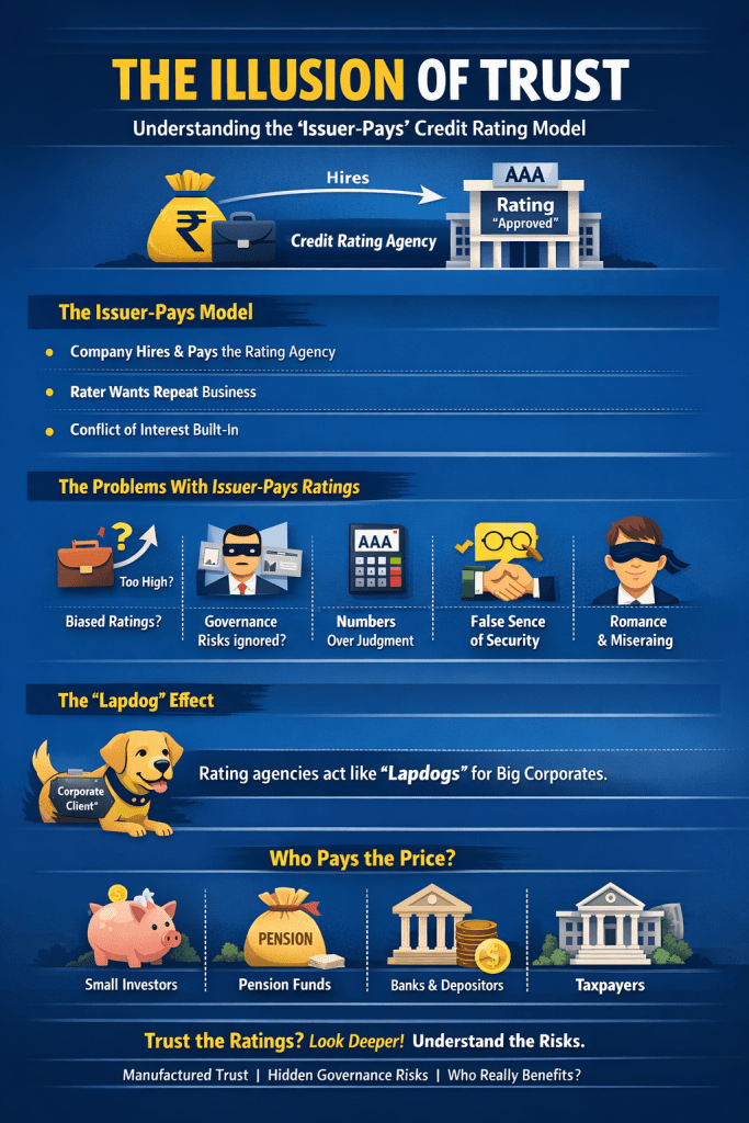 This article critically examines the CRISIL AA+/Stable rating assigned to Piramal Finance Limited on January 4, 2026, framing it as a “manufactured illusion” that prioritizes quantifiable metrics like capital adequacy while systematically overlooking deep-seated governance and forensic risks. Drawing on the issuer-pays model—where the rated entity effectively acts as both student and paid examiner—the analysis exposes structural incentives for rating agencies to deliver favorable outcomes, functioning as “lapdogs” for large conglomerates like the Piramal Group. Through a blend of regulatory mapping, case-specific scrutiny, and activist advocacy, we highlight how this rating enables cheaper borrowing and expanded funding access amid legacy issues from the DHFL acquisition, political proximities, and unaddressed vulnerabilities. The piece calls for dismantling the oligopolistic ratings ecosystem, shifting to investor-pays alternatives, and enforcing genuine accountability to prevent the socialization of losses onto retail investors and the public. This extends prior critiques of Piramal entities, urging a reevaluation of trust in a system riddled with conflicts and biases.