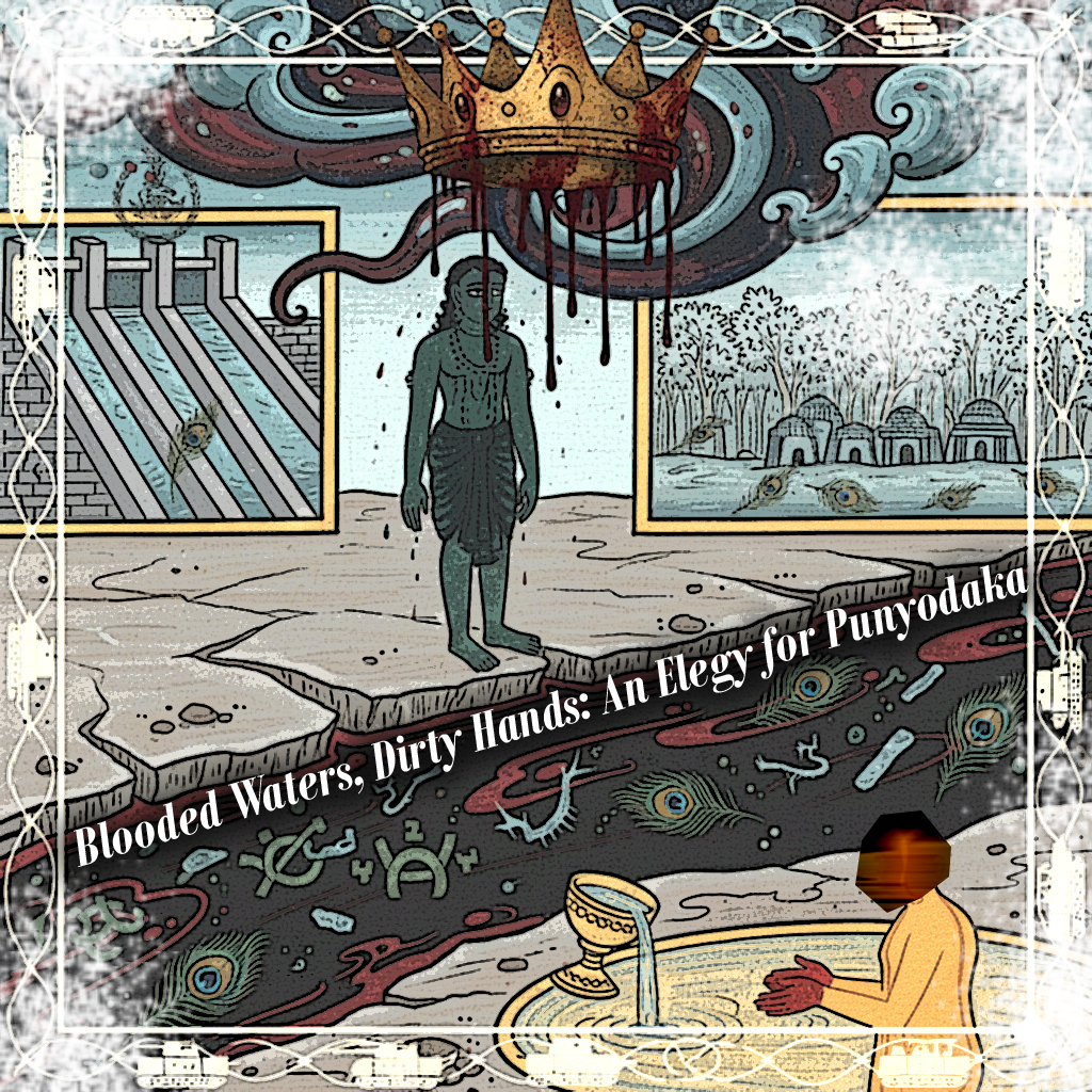 This text is an elegy for puṇyodaka—not as a lost ritual substance, but as a shattered moral condition. Moving across Kalidasa’s Meghadūta, the Vana Parva’s Yaksha-prashna, biblical plague, Macbeth’s indelible blood, and Sartre’s Dirty Hands, it traces how water—river, sea, confluence—has been converted into spectacle, alibi, and instrument of power. Empirical poisonings (heavy metals, fecal coliforms, ecological collapse) coexist with choreographed immersions, artificial ghats, and submarine devotions, revealing a regime of simulation where sanctity is performed while rivers rot and silences are enforced. The work argues that contemporary governmentality no longer seeks purity but stages it, laundering violence through ritual, nationalism, and necessity. Against Hoederer’s calculus and Macbeth’s despair, the Yaksha’s ancient answer—manomalatyāga, the renunciation of inner stain—returns as an indictment: when minds remain polluted by greed, vanity, and commanded quiet, no river can cleanse. Puṇyodaka vanishes not because water fails, but because power poisons meaning itself. What remains is refusal: the withdrawal of consent from any politics that needs blood to function, spectacle to survive, and dirty hands to rule.