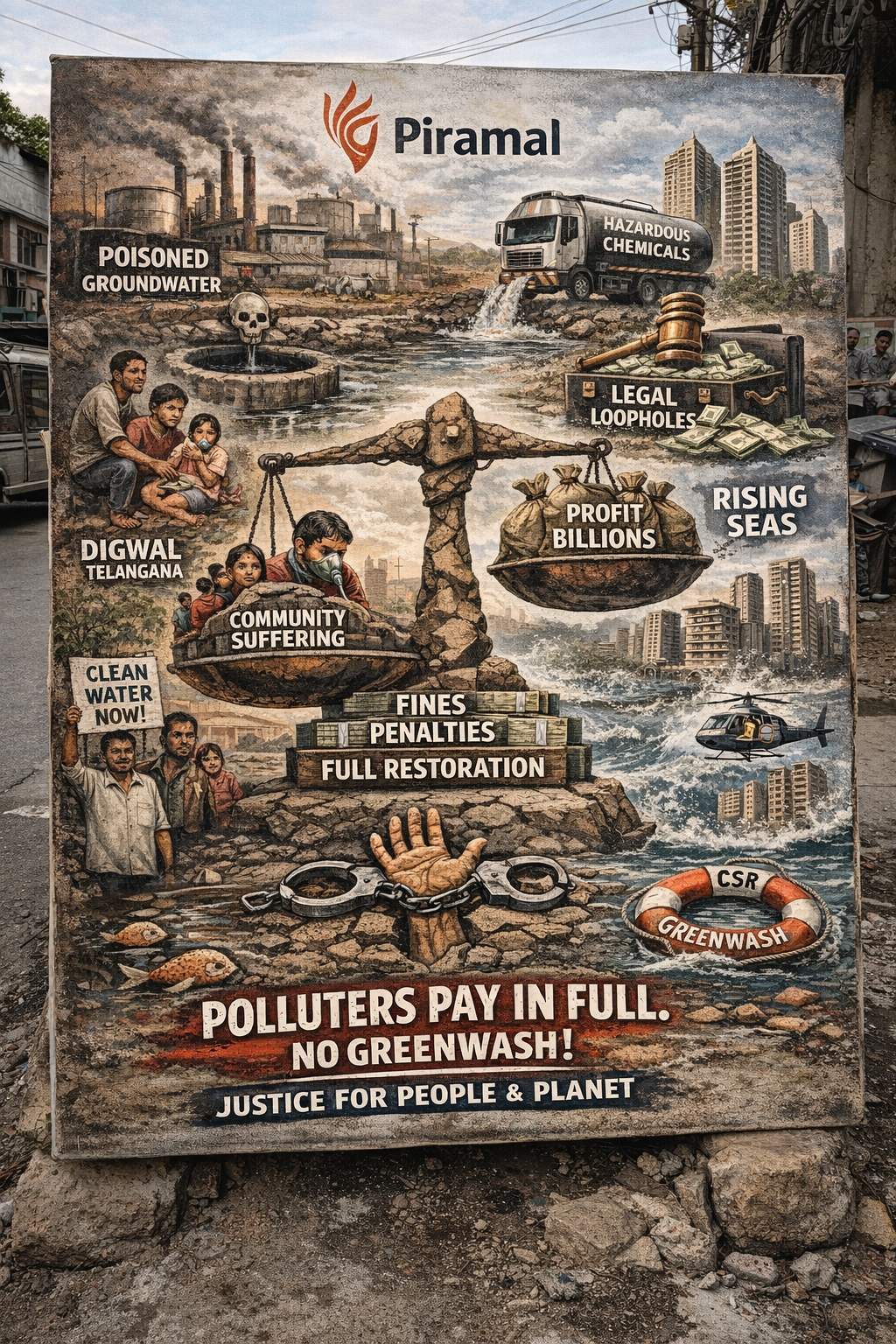 This essay argues that the Piramal Group’s pharmaceutical and real-estate operations exemplify a systemic model of accumulation by dispossession in contemporary capitalism, wherein ecological harm, public-health burdens, and climate vulnerability are externalized onto marginalized communities while profits are privatized and reputational risk is managed through regulatory reprieves, corporate restructuring, and CSR spectacle. Through the long-running groundwater contamination crisis at Digwal, the very recent February 2026 hazardous discharge episode at Dahej affecting the Narmada-linked canal system, and the development of ultra-luxury coastal real estate in flood-prone zones of Mumbai, the text demonstrates a recurring pattern: violation, brief enforcement theatre, rapid operational normalization, and uninterrupted high-margin expansion. It situates these cases within theoretical frameworks of slow violence, ecological surplus extraction, and philanthropic greenwashing, arguing that fines function as licensing fees rather than deterrents and that dynastic corporate networks convert environmental risk into both profit and spectacle. The essay concludes by demanding a materially enforced Polluter Pays regime—extending beyond monetary penalties to full ecological restoration, community restitution, structural limits on expansion, and legally binding accountability—insisting that environmental justice cannot be offset through philanthropy, CSR branding, or procedural compliance while the biosphere itself absorbs irreversible damage.