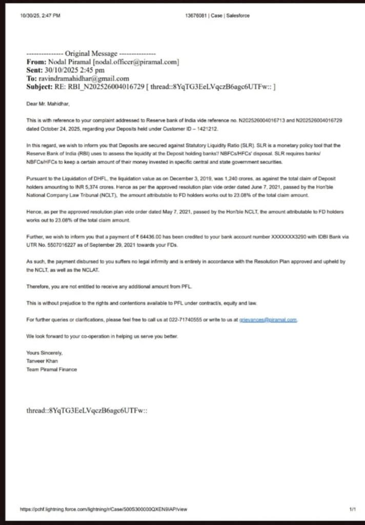 Below is the response received by Mr. Mahidhar from the Piramal Nodal Office, which appears to be a standard copy-paste reply, similar to what we have received previously: