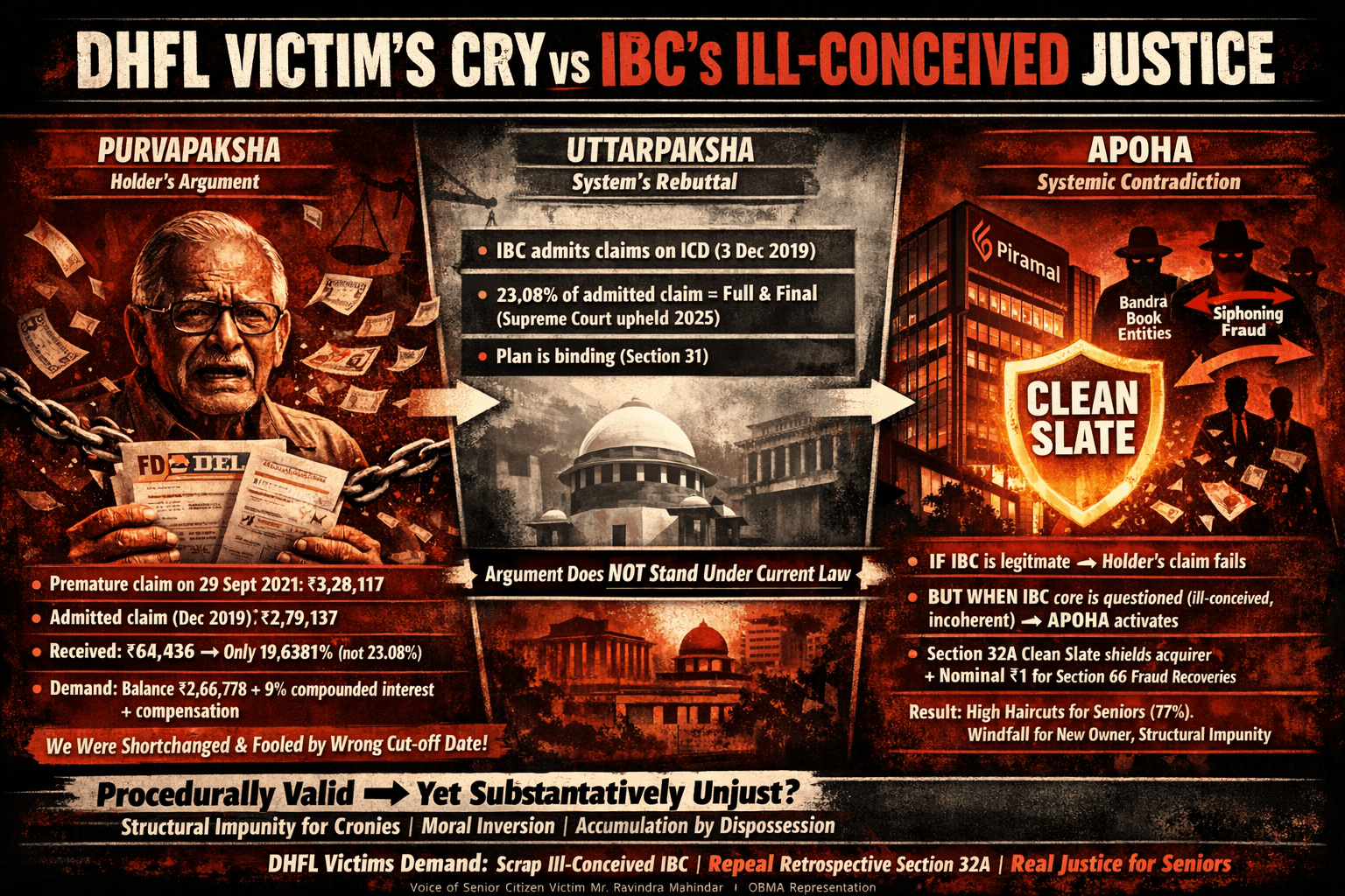 This article examines a senior DHFL fixed deposit holder’s grievance against the 23.08% recovery under the Piramal resolution plan. In Purvapaksha, Mr. Ravindra Mahidhar, the senior citizen FD Holder in question, argues that using the December 2019 cut-off instead of the 29 September 2021 payment date shortchanged him, recalculating his claim at ₹3,28,117 (versus the admitted ₹2,79,137) and receiving only 19.64% instead of 23.08%. Uttarpaksha rebuts that under IBC rules, claims are fixed at the Insolvency Commencement Date, the payment matches the approved plan, and the Supreme Court (2025) upheld it as binding and final. Apoha then probes the deeper paradox: while the individual claim fails if IBC is accepted as legitimate, questioning the IBC’s core as an ill-conceived and incoherent law reveals structural contradictions — particularly between Section 32A’s clean slate immunity and Section 66’s fraud recovery provisions — raising concerns of systemic unfairness, moral hazard, and crony sanitisation for retail victims.