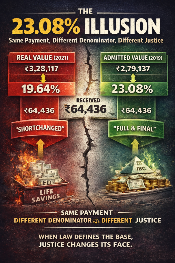 - Against his recalculated claim of ₹3,28,117, the received amount works out to only 19.6381% (not the advertised 23.08%).