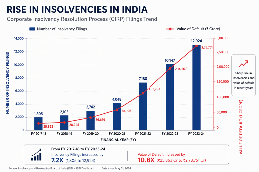 This multi-layered architecture created a perfect storm of delays, appeals, and protective moratoriums. Promoters could easily retain management control while assets depreciated, funds were diverted, and enterprise value evaporated. Formal “bankruptcy” or winding-up proceedings were rare not because distress was uncommon, but because the system actively discouraged creditors from pushing companies into resolution. Instead, it incentivised endless litigation, negotiations behind closed doors, and political or bureaucratic interventions that prolonged the agony of public-sector banks and other creditors.