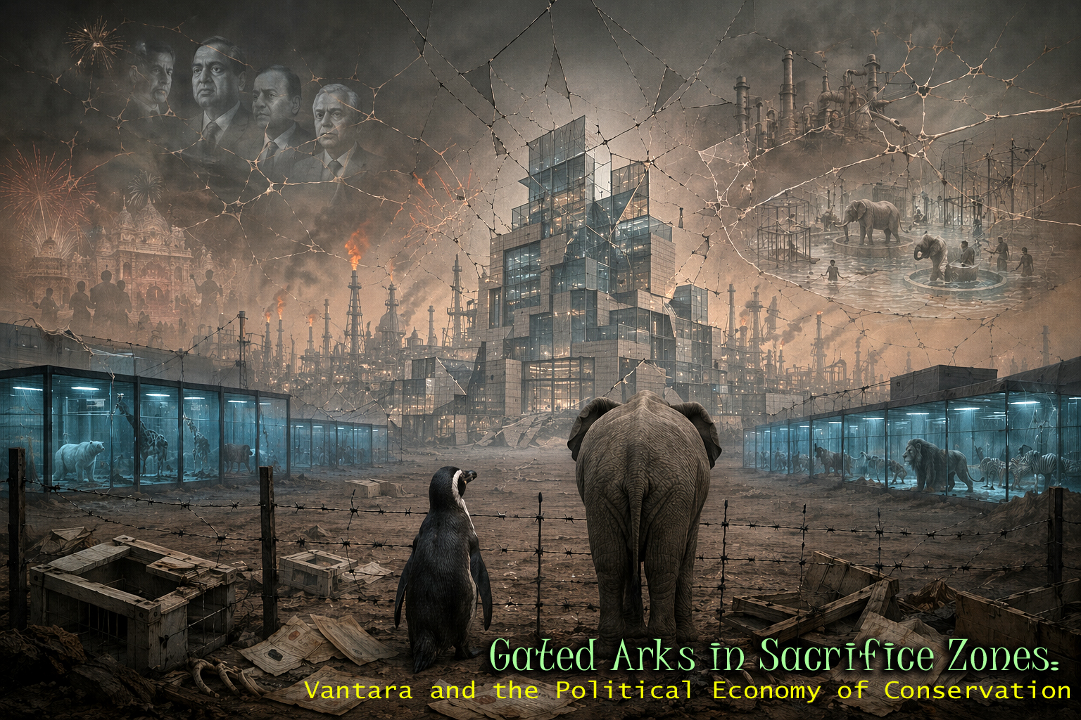 Vantara was literally carved from this same industrial “green belt” inside the refinery’s SEZ boundaries, benefiting from the same eminent-domain acquisitions, tax incentives, and regulatory forbearance that have long favoured the Ambani conglomerate. The adjacency is not incidental: the sanctuary’s energy-intensive cooling systems for non-native species operate in a landscape already scarred by petrochemical activity. Emissions and pollutants do not respect the sanctuary’s perimeter; chilled penguins and relocated elephants may still inhale air laced with industrial byproducts and draw water from aquifers compromised by decades of contamination. Drawing on Rob Nixon’s framework of “slow violence,” this arrangement exemplifies state-endorsed crony capitalism at its most refined form: habitats are first destroyed, refugees (human and nonhuman) are manufactured, and then those same refugees are enclosed and displayed as evidence of corporate benevolence.
