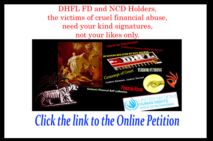 Posted on 11/10/2023 (GMT 19:45 hrs) Dear Friends, May you please help me out by signing this petition? If you wish, kindly circulate it among your relatives and friends to rescue DHFL Victims from cruel financial abuse. Please follow the link below: PETITION LINK: https://chng.it/zJH6rzrfhh Petition Promotion poster for Facebook PETITION STATUS (11/10/2023; GMT 19:38Continue reading “DHFL Victims Need More and More Signatures along with “chip in” (if possible)”